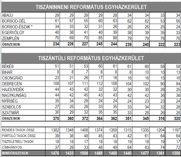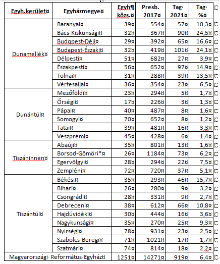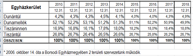 Tagok részaránya a 2017-ben megválasztott presbiterek számához viszonyítva, egyházmegyénként (2021.02.)
